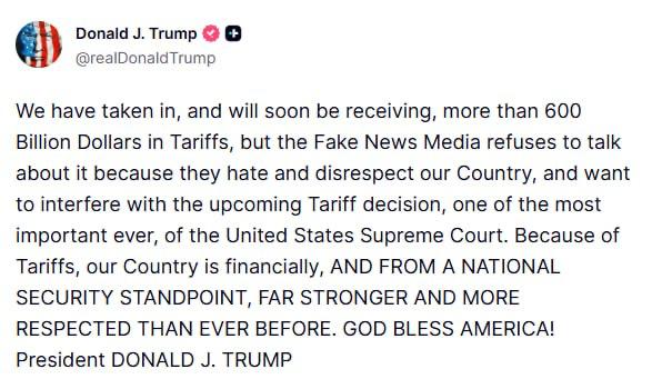 По его словам, некоторые "фейковые СМИ" намеренно замалчивают этот факт, потому что не уважают страну и хотят повлиять на решение Верховного суда США по вопросу тарифов, хотя он считает, что введение пошлин – "одно из самых важных решений в истории страны".