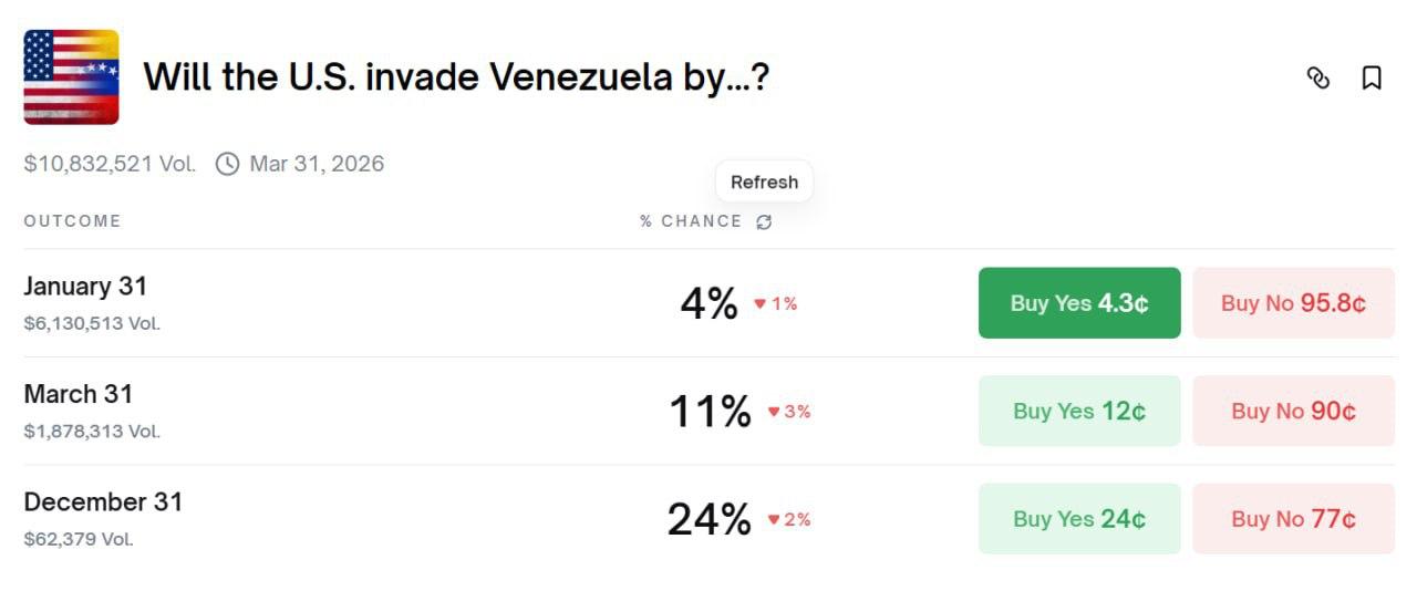 Букмекерское агентство Polymarket не выплатит выигрыш за ставки на вторжение в Венесуэлу, пишет FT.