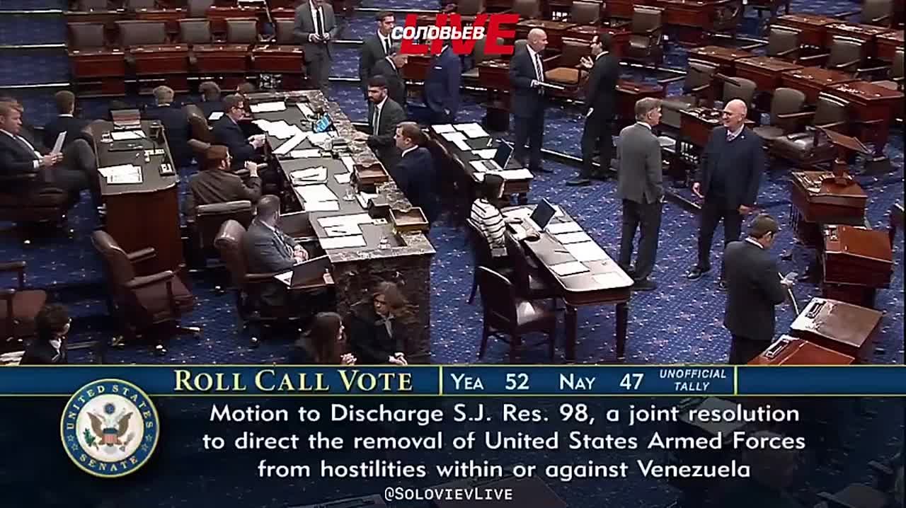 Сенат США проголосовал за запрет Дональду Трампу предпринимать дальнейшие военные действия против Венесуэлы без одобрения Конгресса. За документ высказались 52 сенатора, против — 47.