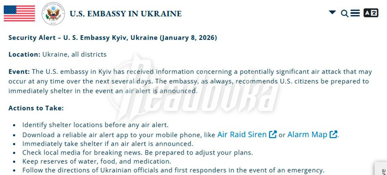 Посольство Штатов в Киеве заявило о получении информации о потенциально серьезной воздушной атаке, которая может произойти в любое время в ближайшие несколько дней. Дипломаты призвали американских граждан быть готовыми немедленно укрыться при объявлении тревоги.