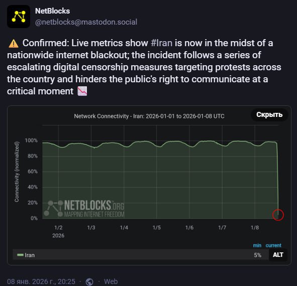 В Иране на фоне протестов отключён интернет — служба мониторинга NetBlocks.