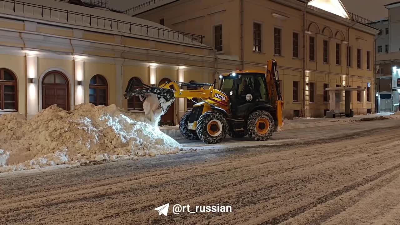 В Москве коммунальщики круглосуточно убирают с улиц тонны снега после мощной метели.