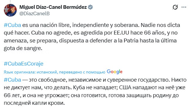 Президент Кубы Мигель Диас-Канель: Куба готова до последней капли крови защищать свою независимостьПрезидент Кубы Мигель Диас-Канель Бермудес ответил на сегодняшние угрозы президента США Дональда Трампа против Кубы:«У них нет никакого морального права...