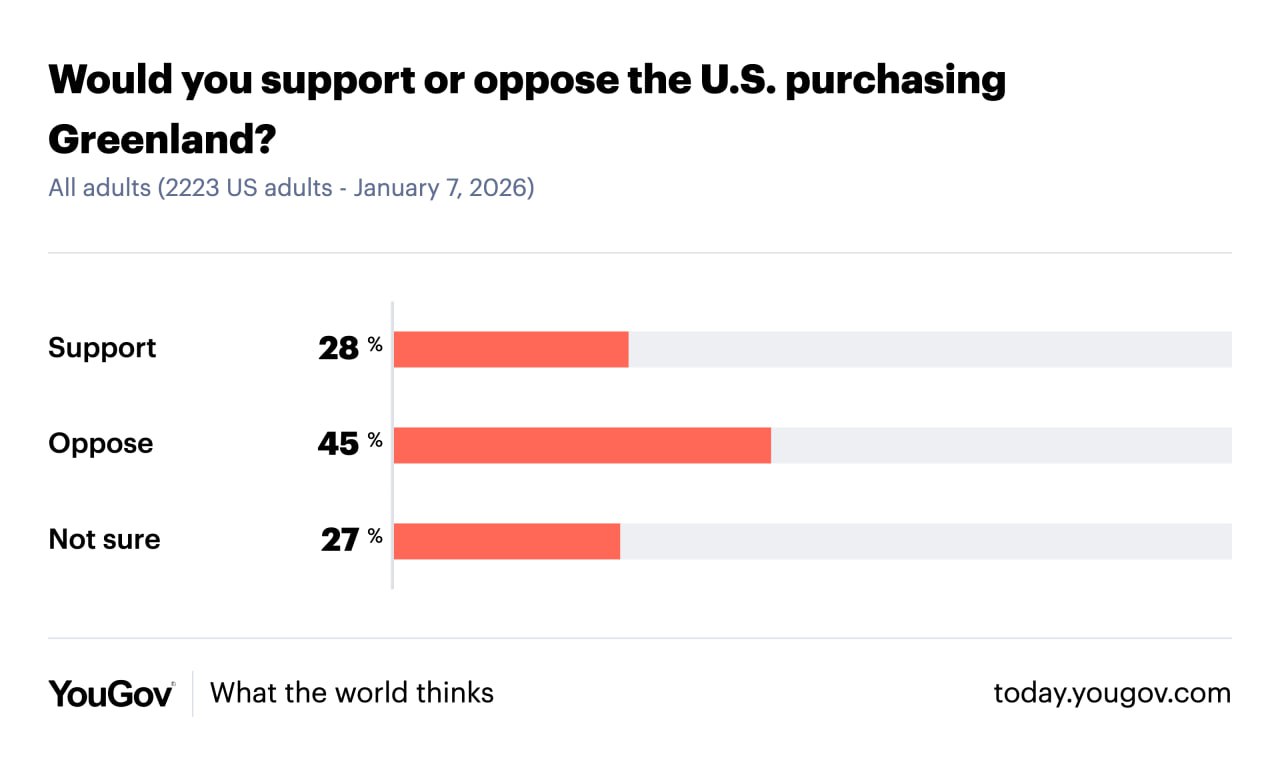 При этом на вопрос о том, насколько важна Гренландия для национальной безопасности США, 16% ответили «очень важна»,