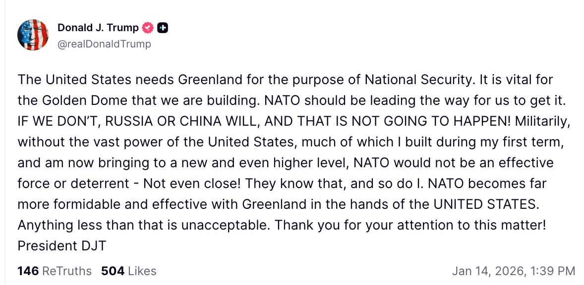 "Если мы этого не сделаем, то это сделают Россия или Китай, и это недопустимо. НАТО станет гораздо более грозным и эффективным, если Гренландия будет в руках США. Альтернатив попросту нет", — заявил президент США в соцсети Truth.