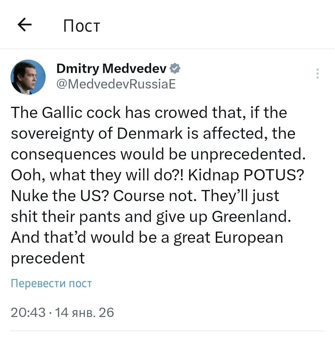 «Галльский петух прокукарекал, что если суверенитет Дании будет нарушен, последствия будут беспрецедентными. Интересно, что будет? Украдут президента США? Ударят ядерным оружием по союзнику? Нет, конечно. Просто сдадут Гренландию, наделав полные штаны дерьма. И вот это уже отличный европейский прецедент».