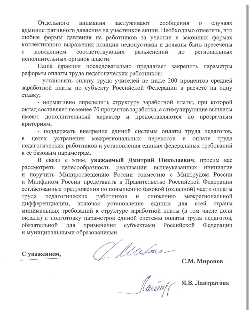 Мне сообщают об административном давлении на участников профсоюзной акции – оно недопустимо! Вместо этого власти необходимо прислушаться к требованиям профсоюза и нашей партии. В стране нужна единая система оплаты труда педагогов, основанная на базовых параметрах, которые предлагает «Справедливая Россия»:
