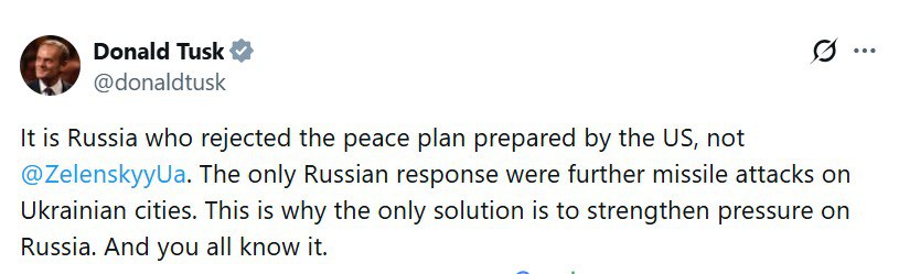 ‘Это Россия отвергла мирный план, подготовленный США, а не Зеленский’ – Туск заступился за киевского попрошайку.