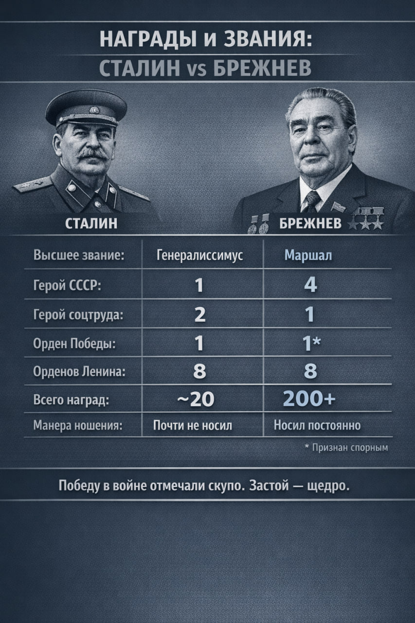 Добрый вечер, друзья. Несколько моих постоянных подписчиков укоряют меня за сравнение в сегодняшнем стриме Трампа и Брежнева. Просьба слушать внимательно о чем и как я говорил. Речь шла о любви к "цяцькам" а не про сравнение и заслуги. Если один забирает нобелевскую медаль, а другой сам себе повесил четыре звезды Героя и 200 медалей, то это проблема их психики, а не моей оценки. Это болезненный нарциссизм. При этом я однозначно отделил "любовь к железкам" от оценки заслуг Брежнева . Некоторые даже пишут о реально заслуженных наградах Брежнева. Правда? Четырежды Герой, маршал и больше 200 медалей - правда заслужил? Ну, хотел полковник Брежнев дать дорогому Леониду Ильичу маршала и четыре звезды, да и ладно. Его дело. Но хорошо бы отделять заслуги от "мечт". Посмотрите хотя бы эту краткую таблицу и сравните. Потом подумайте. Не критикую. Просто объясняю )) Ваш Доктор