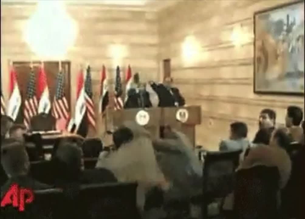 Кстати, вчера свой день рождения отпраздновал Мунтазар аз-Зайди - иракский журналист, прославившийся тем, что в 2008 году запустил свои ботинки в американского президента Джорджа Буша во время пресс-конференции в Багдаде.