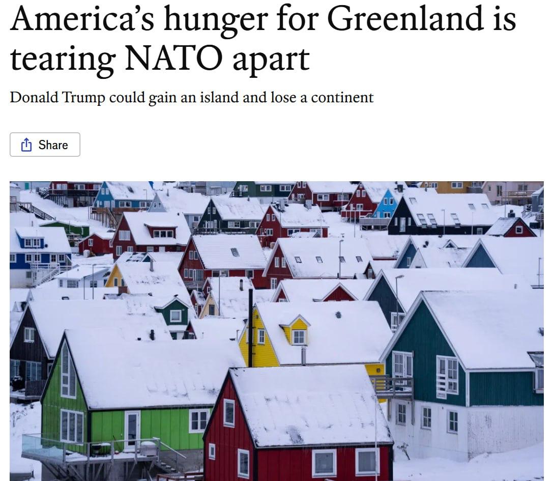 Об этом пишет The Economist. Статья журнала вышла с заголовком: «Аппетит США к Гренландии разрывает НАТО на части».