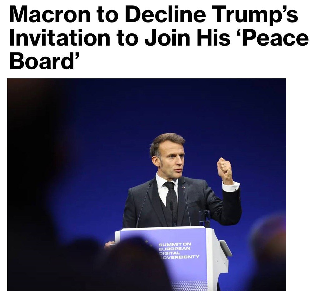 Макрон не примет приглашение Трампа присоединиться к его Совету мира, пишет Bloomberg.