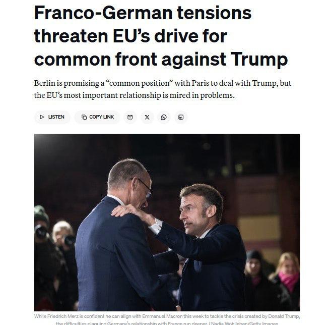 Для французов одна из главных проблем в этом вопросе — отсутствие чёткой позиции Берлина по ответу на пошлины Трампа и попытки Германии показать себя доминирующим игроком в Европе. Для немцев — застопорившаяся совместная программа создания истребителей и отложенный план использования российских активов для финансирования Украины.