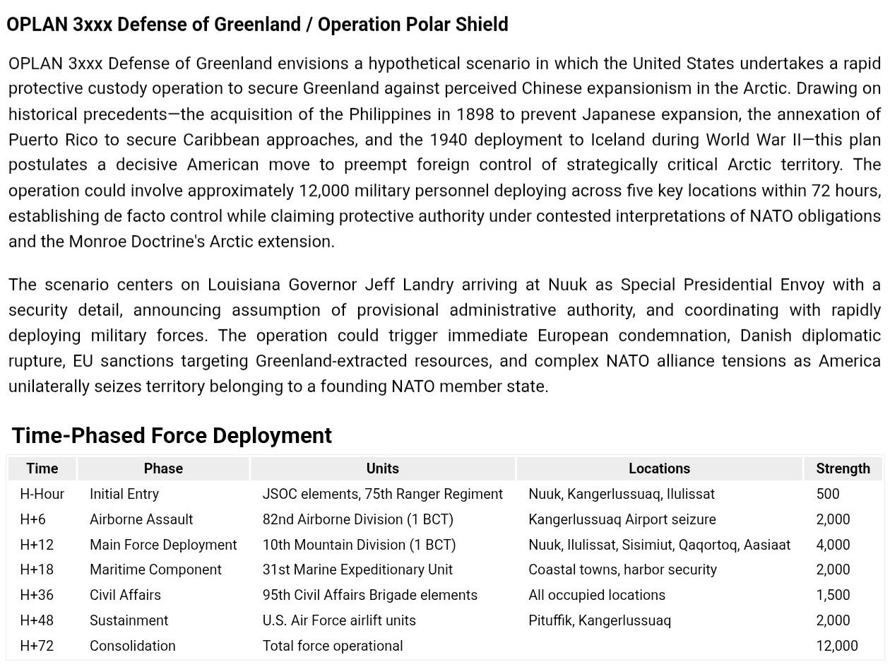 В сценарии предполагается поэтапное развертывание около 12000 военнослужащих в течение 72 часов, установление фактического контроля и одновременное утверждение защитной власти.