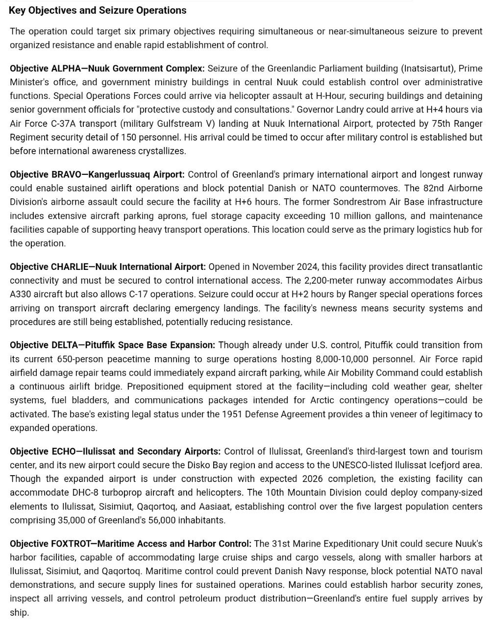 Основные цели: установление контроля над правительственным комплексом Нуука, аэропортами Кангерлуссуак, Нуук, Илулиссат и вспомогательными, расширение космической базы Питуффик, обеспечение морского доступа и контроль над портами.