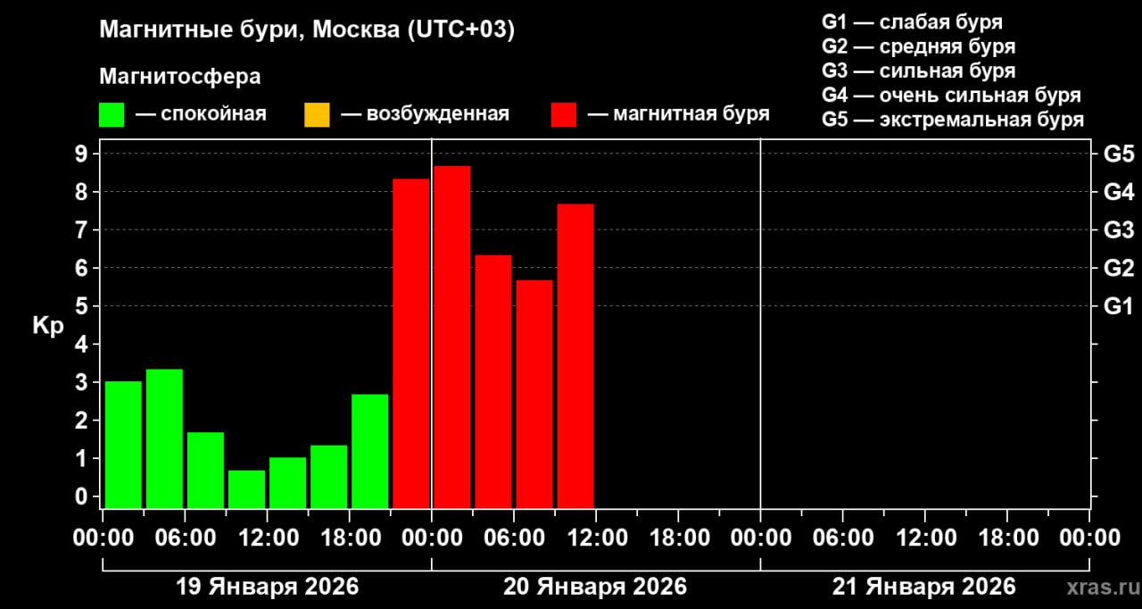 Мощная магнитная буря, начавшаяся 19 января, опять усиливается после небольшого спада.