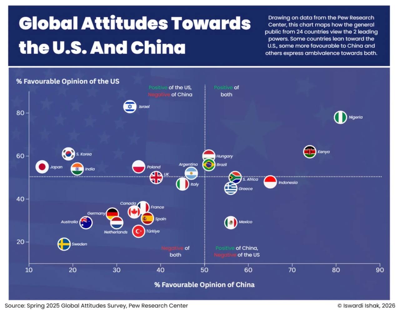 Традиционные союзники США вроде Японии, Южной Кореи и Израиля прочно закрепились в проамериканском и антикитайском квадрате. В то время как большая часть Западной Европы выражает скептицизм по отношению к обеим державам.