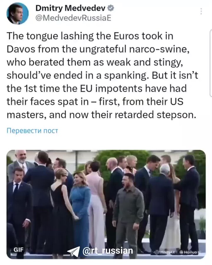«Выговор неблагодарной наркосвиньи в Давосе, назвавшей европейцев слабыми и скупыми, должен был закончиться поркой. Но нет, европейским импотентам не впервой получать плевки прямо в лицо. Раньше от американских хозяев, а теперь и от своего пасынка-олигофрена».