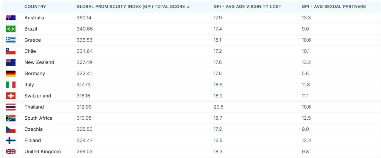 Рейтинг составило издание World Population Review. В списке 45 стран. За основу брали такие критерии, как средний возраст первого полового контакта, число сексуальных партнёров и легальность проституции.