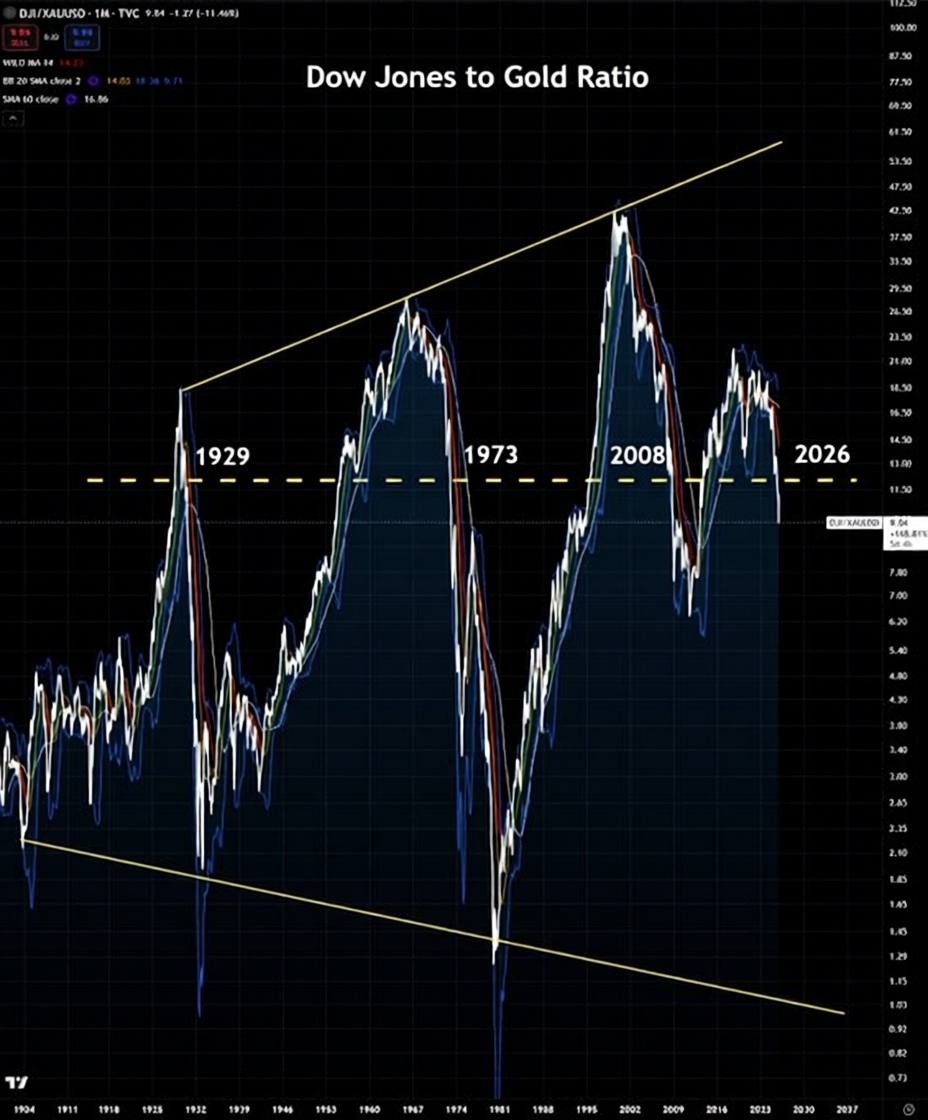 перед Великой депрессией 1929-го, нефтяным шоком и стагфляцией 1973-го, глобальным крахом 2008-го… и вот теперь — 2026-й.Каждый раз этот уровень знаменовал не просто коррекцию, а фундаментальный слом американской финансовой системы, а следовательно и большие последствия для мировой экономики.
