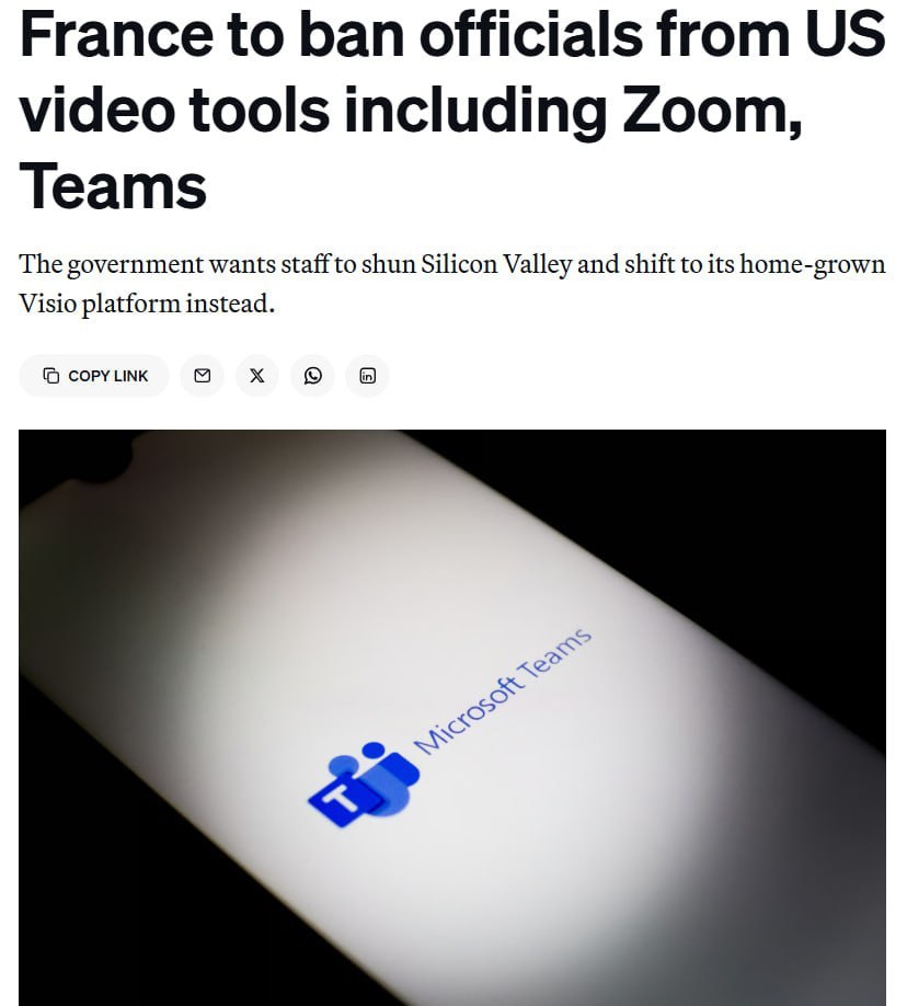 Чиновники должны перейти на французскую платформу для видеоконференций Visio. Всё это происходит на фоне растущей обеспокоенности в Европе по поводу глубокой зависимости от американских услуг.