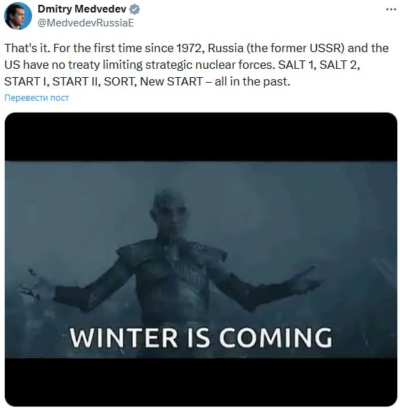 «Всё! Впервые с 1972 года у России (бывшего СССР) и США нет договоренности об ограничении стратегических ядерных сил. ОСВ-1, ОСВ-2, СНВ-1, СНВ-2, СНП, СНВ-3 — всё это в прошлом».