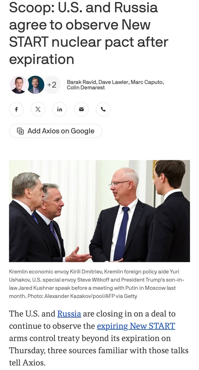 Россия и США договорились соблюдать условия Договора о сокращении стратегических наступательных вооружений еще как минимум 6 месяцев, в течение которых будут вестись переговоры о потенциальном новом соглашении — источники Axios.