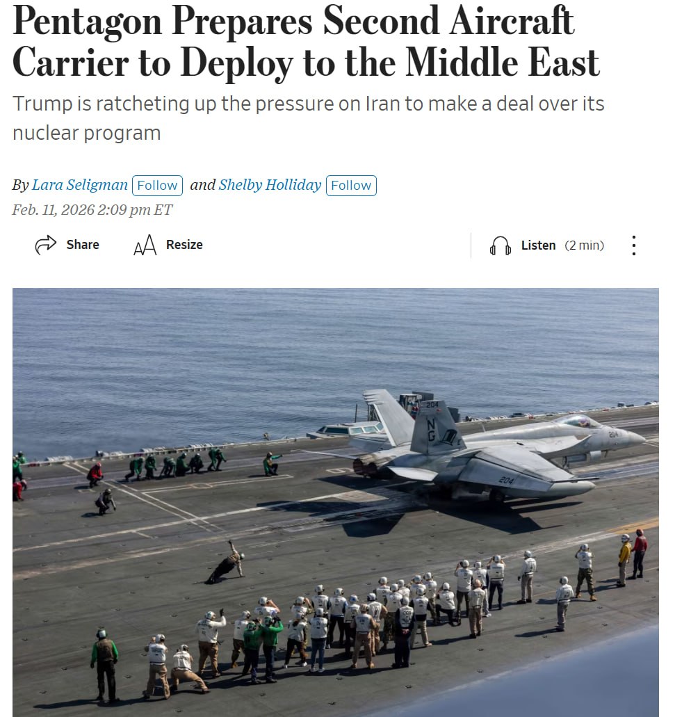 Пентагон готовит второй авианосец с ударной группой для развёртывания на Ближнем Востоке и возможной атаки на Иран, пишет WSJ.