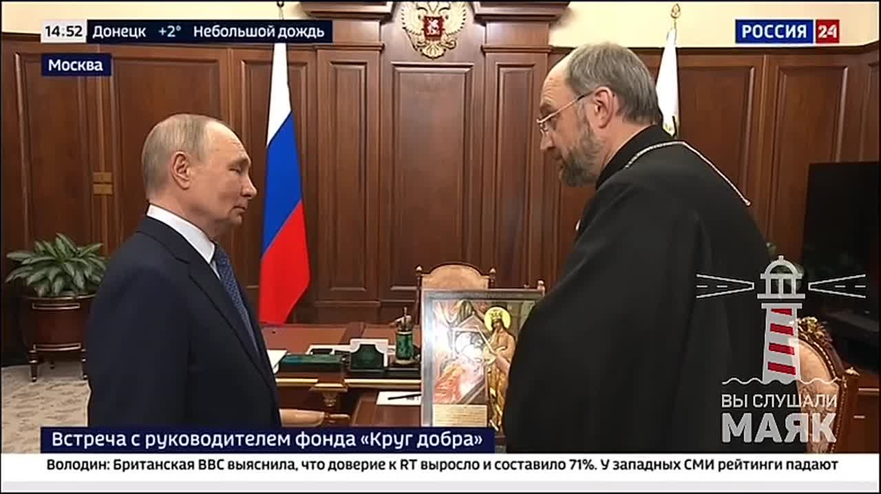 Глава фонда «Круг добра» протоирей Александр Ткаченко подарил Владимиру Путину икону Божией Матери «Целительница».Подписаться на RT: ТГ | Зеркало | MAX