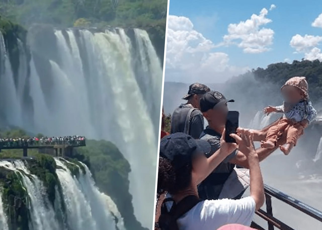 Турист поднял ребёнка над обрывом высотой 80 м на вытянутых руках. Он рискнул ради фото у водопада Глотка Дьявола в Аргентине.