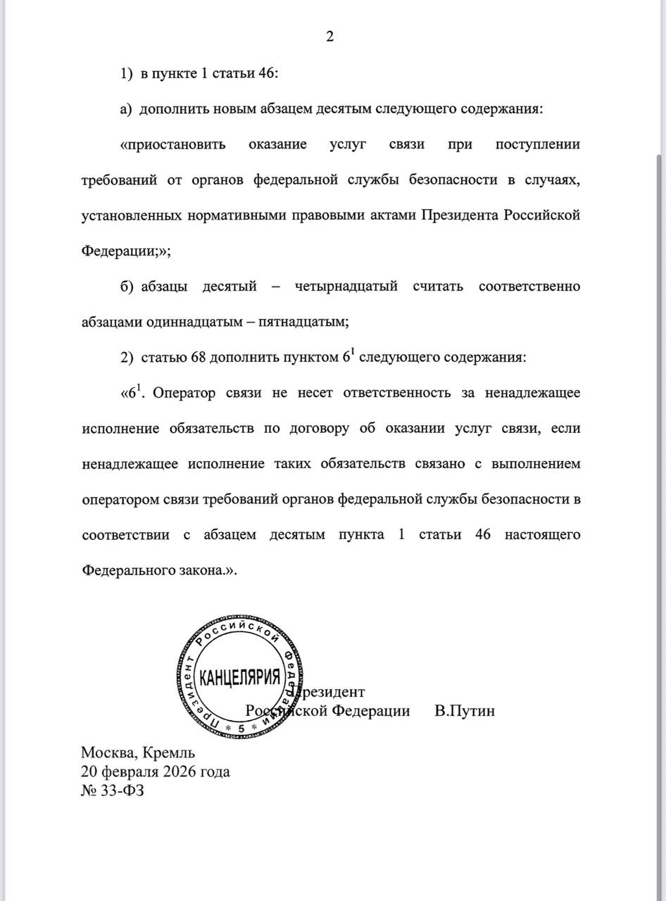 Владимир Путин подписал закон, обязывающий сотовых операторов отключать связь по требованию ФСБОператоры не будут нести ответственность за перебои связи в таких случаях.Подписывайтесь на мой канал в MAX!