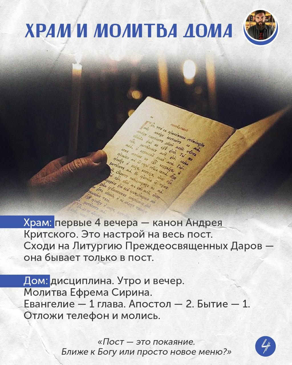 Четвёртое — храм. Первые четыре вечера — покаянный канон Андрея Критского. Не пропусти: это настрой на весь пост. И сходи на Литургию Преждеосвященных Даров. Такое бывает только Великим постом.