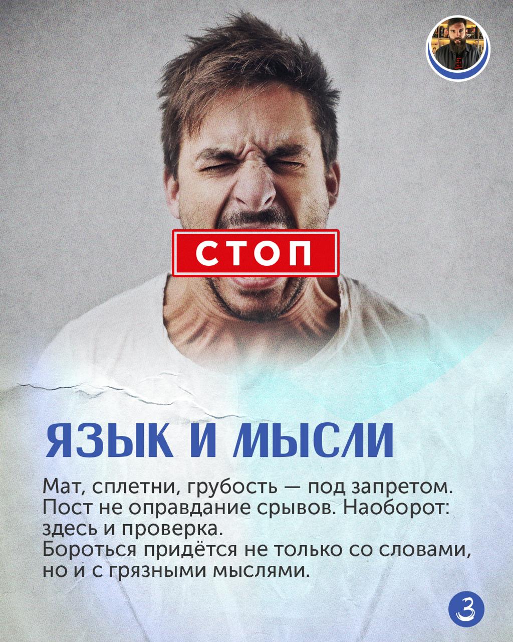 Третье — язык. Мат, сплетни, грубость. Пост не оправдание срывов. Наоборот. И бороться придётся и со словами, и с грязными мыслями.