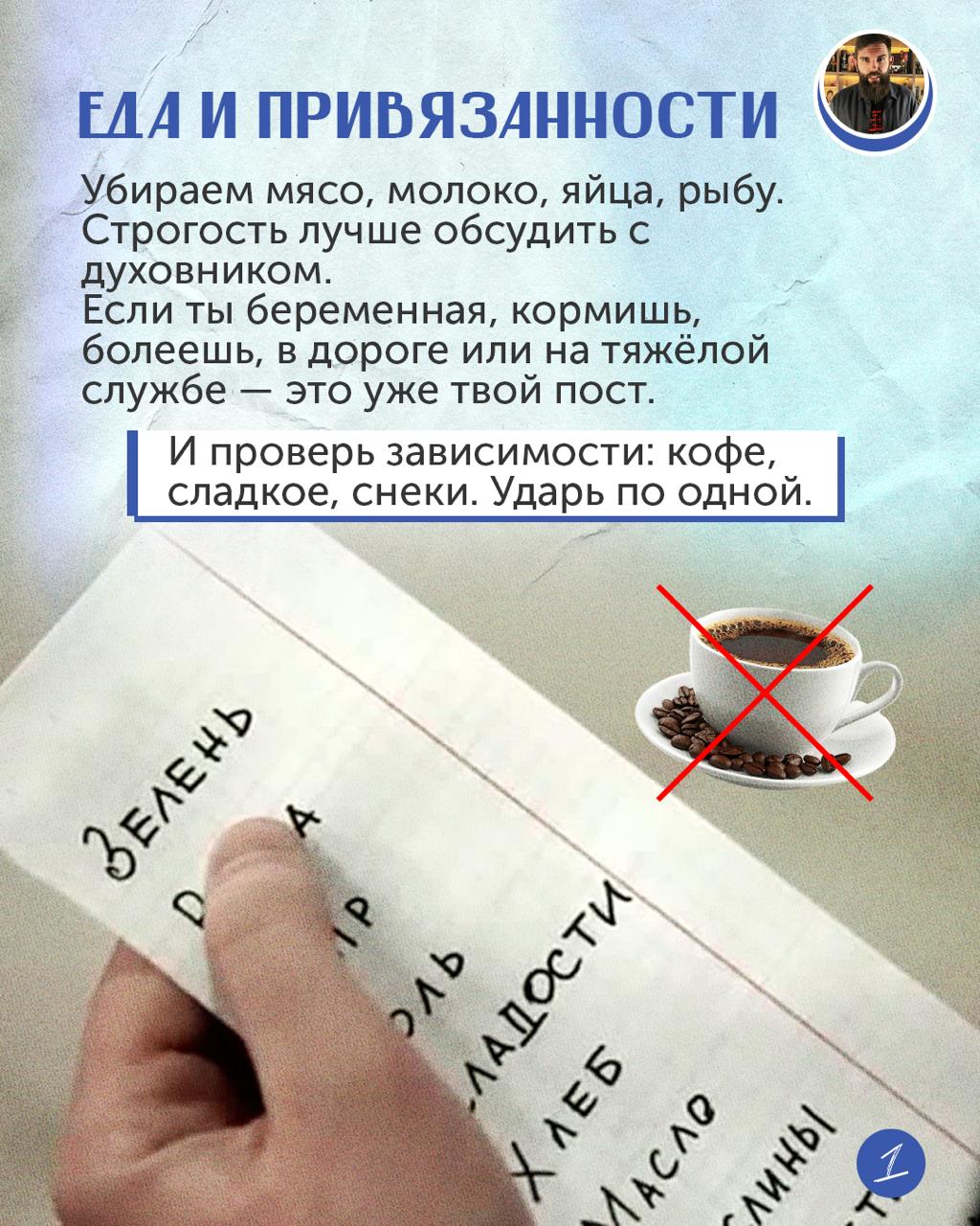 И важная деталь — зависимость. Кофе, конфеты, сахар, сухарики. Попробуй ударить по этой привязанности. Например, убрать на пост кофе.