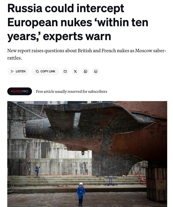 В ближайшее десятилетие Европа рискует лишиться ядерного аргумента при конфликте с Москвой. Об этом говорится в докладе британского аналитического центра RUSI (Королевский институт объединённых родов войск).