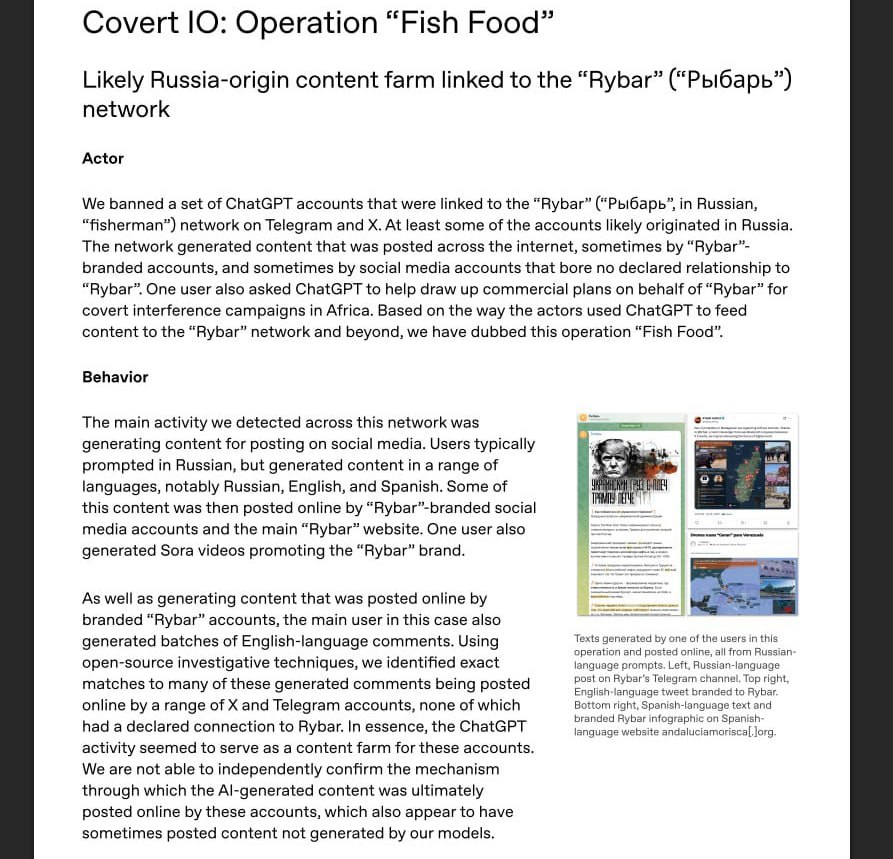 OpenAI выкатили доклад, в котором похвастались, что забанили кучу китайских аккаунтов за троллинг, скам и генерацию контента против премьер-министра Японии. А еще, ну так, между делом, забанили несколько пользователей, которые проверяли тексты Рыбаря на ошибки, редактировали их и переводили на английский для ресурсов под брендом Рыбаря.