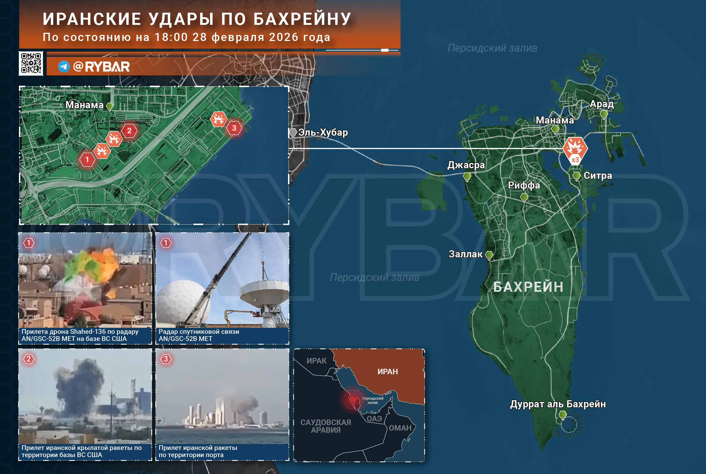 К вечеру можно подвести промежуточные итоги иранских атак на Манаму в Бахрейне, где расположена американская база ВМС и штаб 5 флота ВМС США. Всего зафиксировано три прилета по разным объектам.