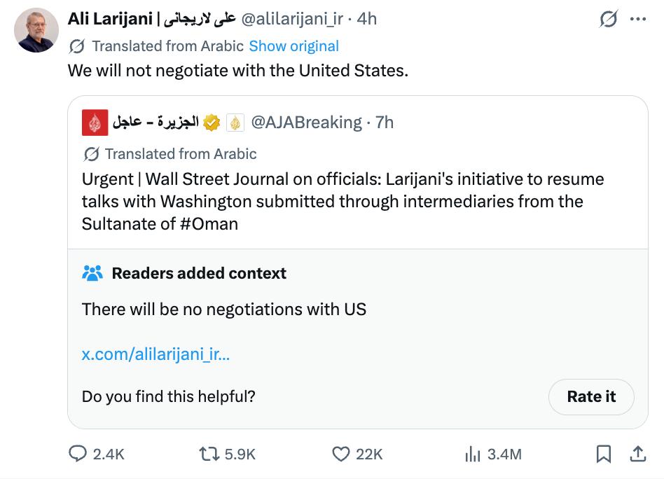 Мы не будем вести переговоры с Соединенными Штатами — Али Лариджани