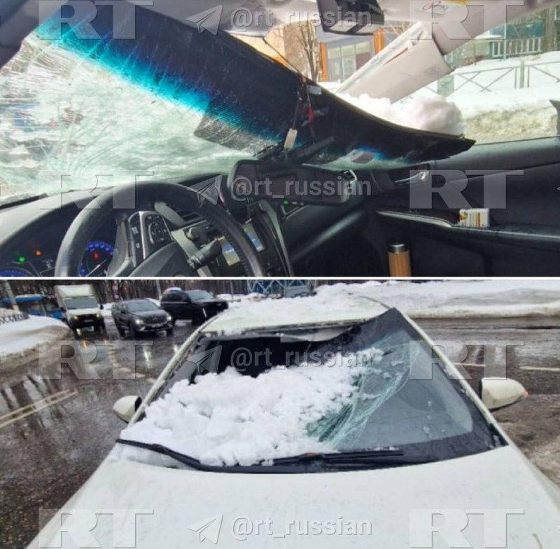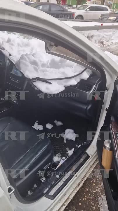 Вместе с ним в салоне была его семья. Мужчина рассказал RT, что, пока ждали скорую и ГИБДД, снегом повредило ещё два авто. А когда приехали инспекторы, на их глазах пробило четвёртую машину.