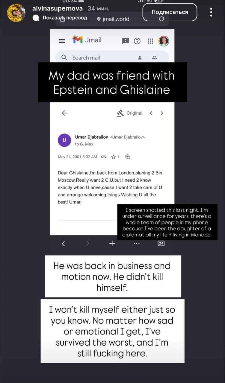 Девушка опубликовала, как утверждается, скрины переписки Джабраилова с Гислейн Максвелл, сообщницей американского финансиста.