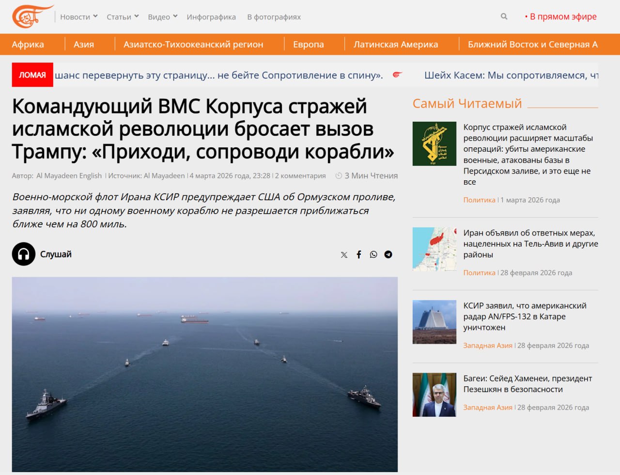 Еще пару дней назад Дональд Трамп объявил о том, что США как можно скорее обеспечат беспрепятственную поставку энергоресурсов через Ормузский пролив. В качестве одного из решений американский президент не исключил и военное сопровождение судов. Тем не менее в командовании ВМС КСИР, судя по вчерашней статье издания Al Mayadeen, в такой вариант развития события, мягко говоря, не верят.