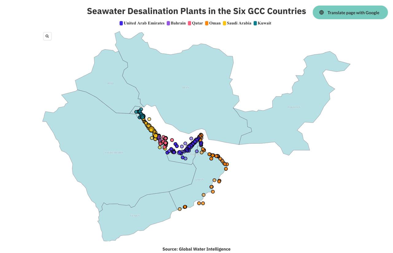 По оценкам, за счёт опреснения Катар получает почти 100% питьевой воды, Бахрейн и Кувейт — порядка 90%, Саудовская Аравия — около 70%, ОАЭ — 42%. В этих пяти странах живёт около 58–60 млн человек. Большая часть живет в крупнейших городах — Эр-Рияде, Джидде, Дубае, АбуДаби, Дохе, Кувейте, Манаме — там доступ к воде зависит от нескольких прибрежных комплексов, которые качают воду по трубам на сотни километров вглубь пустыни.