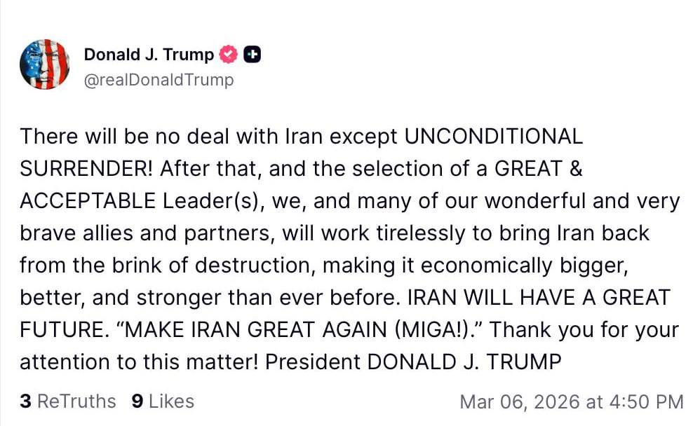 "С Ираном не будет никакой сделки, кроме БЕЗОГОВОРОЧНОЙ КАПИТУЛЯЦИИ! У ИРАНА БУДЕТ ВЕЛИКОЕ БУДУЩЕЕ. СДЕЛАЕМ ИРАН СНОВА ВЕЛИКИМ (MIGA!)", — считает он.