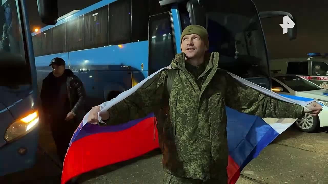На кадрах РЕН ТВ — бойцы с российскими флагами выходят из самолёта и отправляются на автобусах к зданию аэропорта.