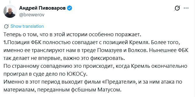 Андрей Пивоваров обвинил ФБК в сотрудничестве с Кремлём. Якобы после решения суда по ЮКОСу они выпустили фильм «Предатели» и работали по материалам предпринимателя Андрея Матуса.