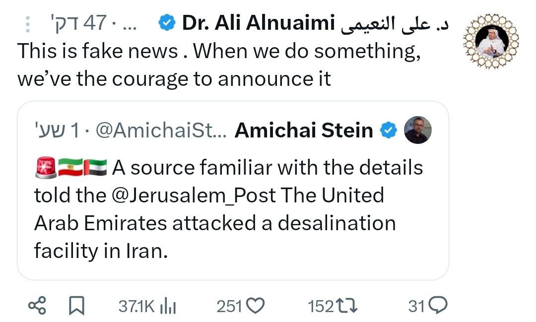 ОАЭ заявили, что не атаковали опреснительный завод в Иране, и что страна не наносит ударов по гражданским объектам