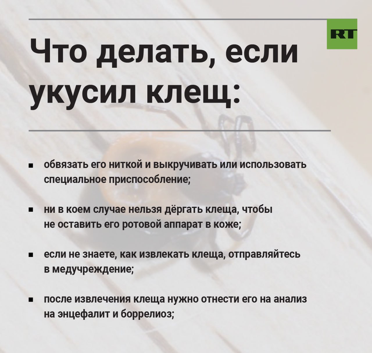 Эксперт посоветовал во время прогулок соблюдать все инструкции, надевать спецодежду и использовать инсектицидные аэрозоли. Подробно о том, как защититься от клещей и что делать при укусе, RT писал здесь.
