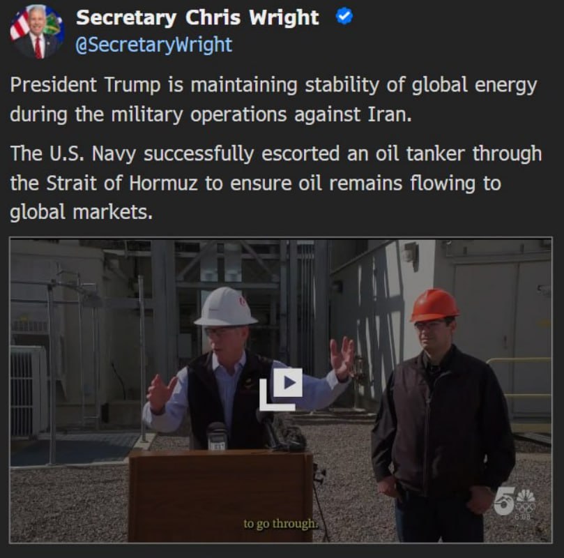 Об этом сообщает ВМС страны. Ранее глава Минэнерго США Крис Райт опубликовал в X пост, где заявил, что танкер успешно прошёл через пролив в сопровождении американских военных.