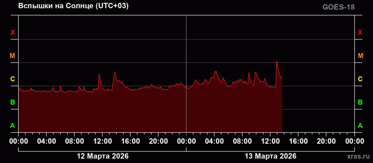 Вспышку относят к событию M-класса. Максимум излучения был достигнут в 12:55 по московскому времени.