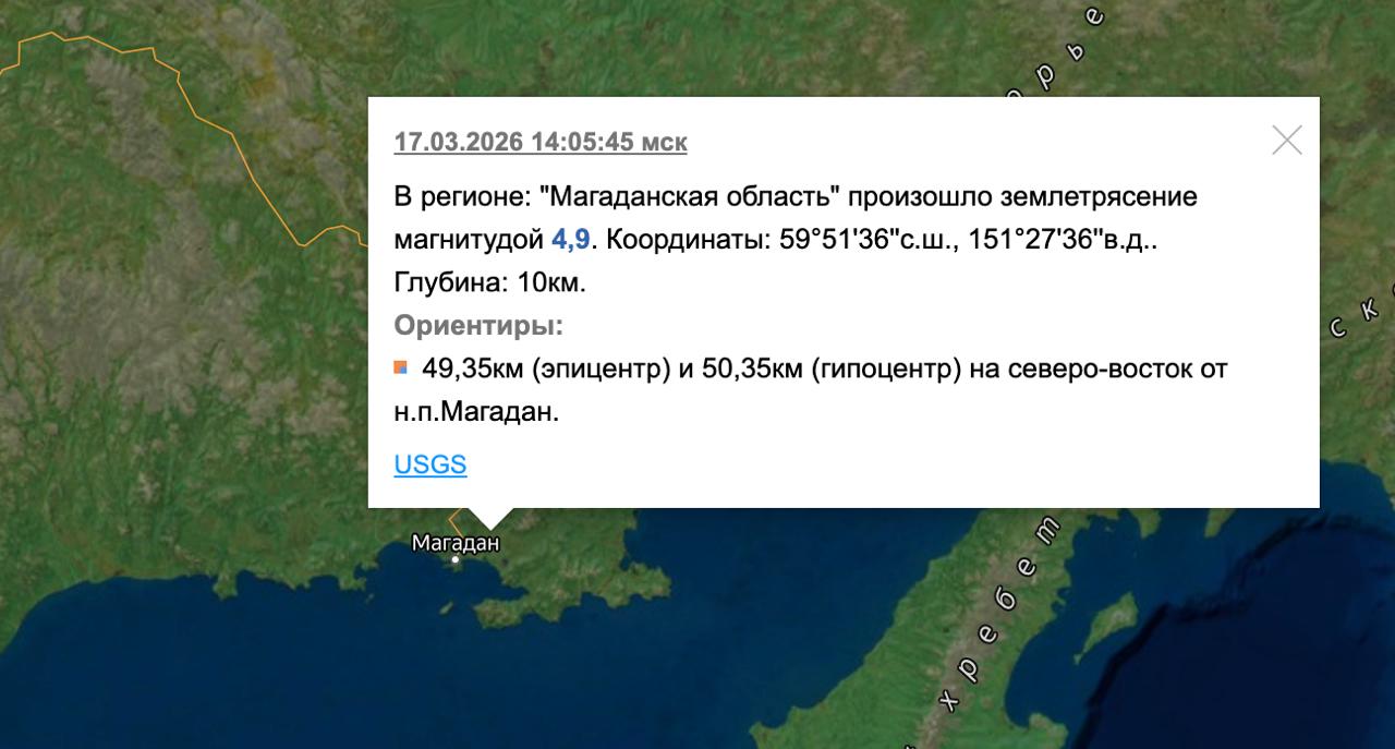 Землетрясение магнитудой почти 5 баллов зафиксировали в Магадане